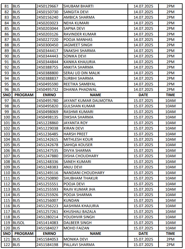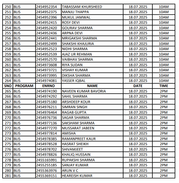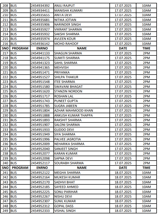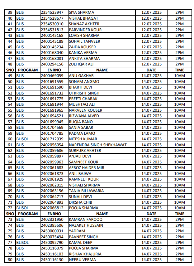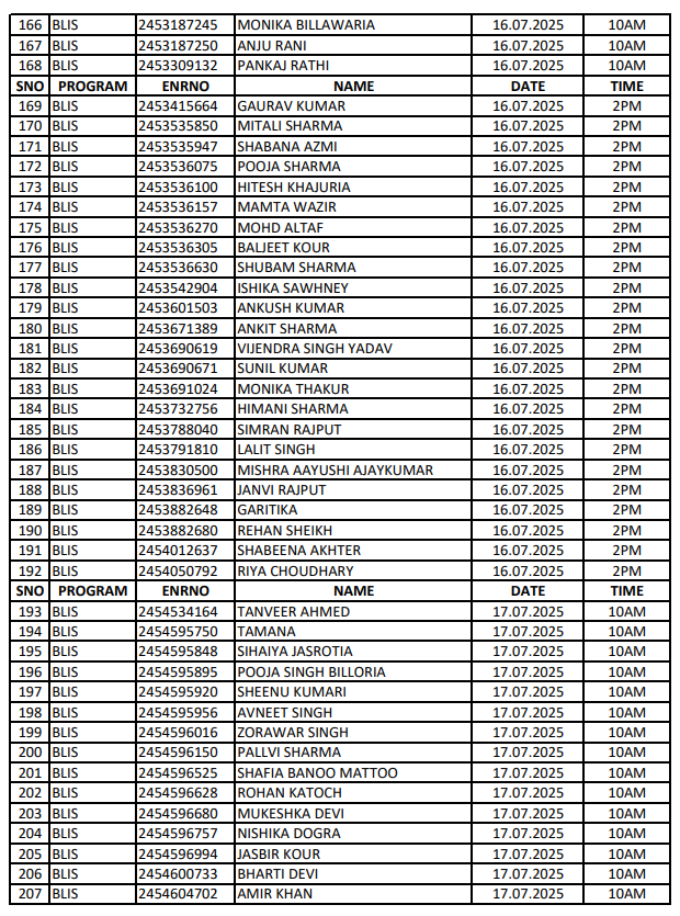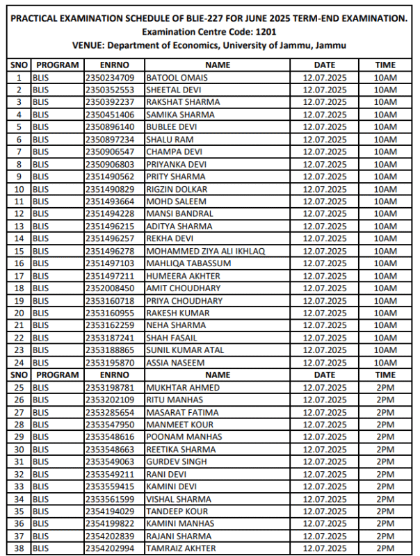 June 2025 term end practical examinations of BLIE227 of BLIS in face to face mode w.e.f. 12.07.2025 till 18.07.2025